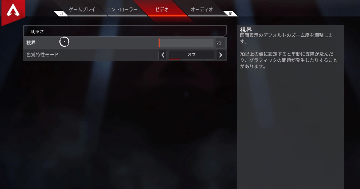 Apex Legendsでは視野角は70〜110の範囲内で設定できます。